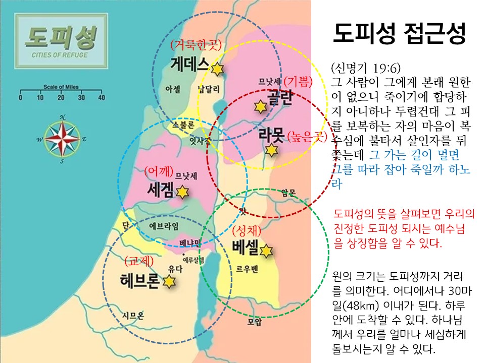 ◈도피성에 피한 자가 도피성을 나가려면 2가지 방법(6절)만 존재한다. ①재판을 받아 무죄를 선고받아야 한다. 도피성에 머물며 공정한 재판을 통해 무죄로 인정받으면 누구도 죽일 수 없기에 나가도 된다. 만약 누군가가 그를 죽인다면 살인자가 된다. ②대제사장이 죽어야 한다. 대제사장의 죽음은 속전이 된다(민35:32). 고의로 지은 살인죄의 속전은 오직 대제사장의 죽음으로 지불된다. 이는 인류의 영원한 대제사장 되시는 예수 그리스도의 죽음을 예표한다. 예수님의 죽음은 자신의 죄를 회개하는 모든 사람의 죄를 용서한다. 예수님만이 진정한 도피성이 되신다. 이스라엘 땅에 있는 6개의 도피성의 이름은 예수님을 상징한다. 갈릴리 게데스(거룩한 곳), 세겜(어깨), 헤브론(교제), 길르앗 라못(높은 곳), 베셀(성채), 므낫세(기쁨) 예수님께 피하는 게 생명의 길이다.