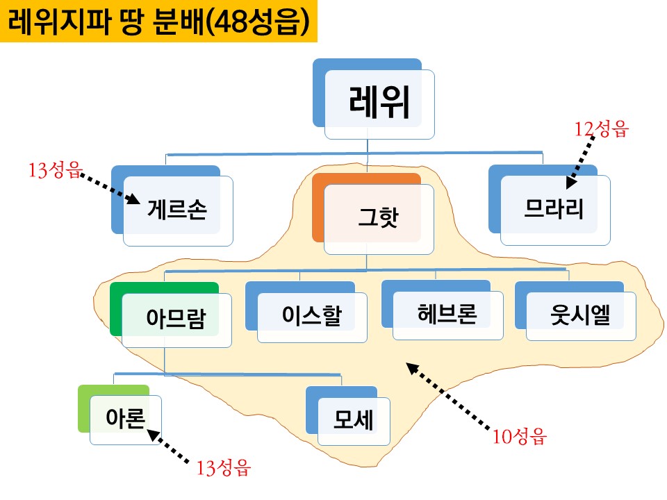 ◈12지파와 여호수아도 땅을 모두 분배받은 후, 가장 마지막으로 레위지파가 땅을 분배받는다. 레위지파는 12지파가 거주할 성읍을 분배해 주어야 하기 때문이다. 레위지파는 그핫 자손 중 아론의 자손, 그핫 자손 남은 자, 게르손 자손, 므라리 자손(4그룹)으로 나누었다. 3지파씩 소유한 성읍을 순서대로 제비뽑게 하였다. 아론 자손은 유다, 시므온, 베냐민 지파의 13 성읍을 받았다. 그핫의 남은 자손은 에브라임, 단, 므낫세반 지파의 10성읍을 받았다. 게르손 자손은 잇사갈, 아셀, 납달리, 바산 므낫세반 지파에게서 13 성읍을 받았다. 므라리 자손은 르우벤, 갓, 스불론 지파에게서 12성읍을 받았다. 이렇게 모두 48개의 성읍을 레위자손에게 주었다.