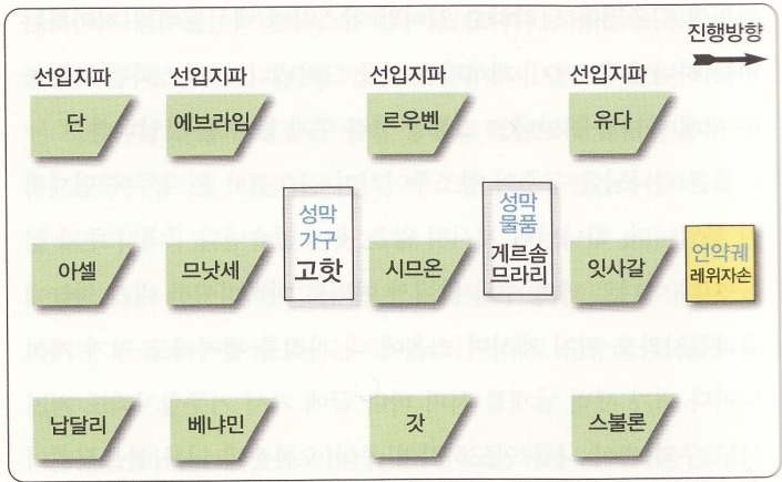 (민 10:11-28) [11] 둘째 해 둘째 달 스무날에 구름이 증거의 성막에서 떠오르매 [12] 이스라엘 자손이 시내 광야에서 출발하여 자기 길을 가더니 바란 광야에 구름이 머무니라 [13] 이와 같이 그들이 여호와께서 모세에게 명령하신 것을 따라 행진하기를 시작하였는데 [14] 선두로 유다 자손의 진영의 군기에 속한 자들이 그들의 진영별로 행진하였으니 유다 군대는 암미나답의 아들 나손이 이끌었고 [15] 잇사갈 자손 지파의 군대는 수알의 아들 느다넬이 이끌었고 [16] 스불론 자손 지파의 군대는 헬론의 아들 엘리압이 이끌었더라 [17] 이에 성막을 걷으매 게르손 자손과 므라리 자손이 성막을 메고 출발하였으며 [18] 다음으로 르우벤 진영의 군기에 속한 자들이 그들의 진영별로 출발하였으니 르우벤의 군대는 스데울의 아들 엘리술이 이끌었고 [19] 시므온 자손 지파의 군대는 수리삿대의 아들 슬루미엘이 이끌었고 [20] 갓 자손 지파의 군대는 드우엘의 아들 엘리아삽이 이끌었더라 [21] 고핫인은 성물을 메고 행진하였고 그들이 이르기 전에 성막을 세웠으며 [22] 다음으로 에브라임 자손 진영의 군기에 속한 자들이 그들의 진영별로 행진하였으니 에브라임 군대는 암미훗의 아들 엘리사마가 이끌었고 [23] 므낫세 자손 지파의 군대는 브다술의 아들 가말리엘이 이끌었고 [24] 베냐민 자손 지파의 군대는 기드오니의 아들 아비단이 이끌었더라 [25] 다음으로 단 자손 진영의 군기에 속한 자들이 그들의 진영별로 행진하였으니 이 군대는 모든 진영의 마지막 진영이었더라 단 군대는 암미삿대의 아들 아히에셀이 이끌었고 [26] 아셀 자손 지파의 군대는 오그란의 아들 바기엘이 이끌었고 [27] 납달리 자손 지파의 군대는 에난의 아들 아히라가 이끌었더라 [28] 이스라엘 자손이 행진할 때에 이와 같이 그들의 군대를 따라 나아갔더라
