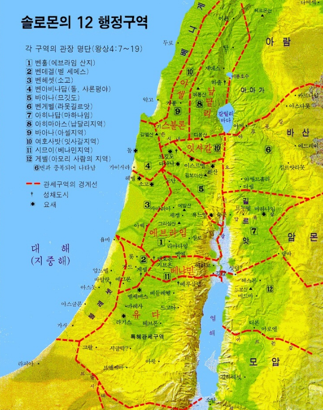 (왕상 4:1-19) [1] 솔로몬 왕이 온 이스라엘의 왕이 되었고 [2] 그의 신하들은 이러하니라 사독의 아들 아사리아는 제사장이요 [3] 시사의 아들 엘리호렙과 아히야는 서기관이요 아힐룻의 아들 여호사밧은 사관이요 [4] 여호야다의 아들 브나야는 군사령관이요 사독과 아비아달은 제사장이요 [5] 나단의 아들 아사리아는 지방 관장의 두령이요 나단의 아들 사붓은 제사장이니 왕의 벗이요 [6] 아히살은 궁내대신이요 압다의 아들 아도니람은 노동 감독관이더라 [7] 솔로몬이 또 온 이스라엘에 열두 지방 관장을 두매 그 사람들이 왕과 왕실을 위하여 양식을 공급하되 각기 일 년에 한 달씩 양식을 공급하였으니 [8] 그들의 이름은 이러하니라 에브라임 산지에는 벤훌이요 [9] 마가스와 사알빔과 벧세메스와 엘론벧하난에는 벤데겔이요 [10] 아룹봇에는 벤헤셋이니 소고와 헤벨 온 땅을 그가 주관하였으며 [11] 나밧 돌 높은 땅 온 지방에는 벤아비나답이니 그는 솔로몬의 딸 다밧을 아내로 삼았으며 [12] 다아낙과 므깃도와 이스르엘 아래 사르단 가에 있는 벧스안 온 땅은 아힐룻의 아들 바아나가 맡았으니 벧스안에서부터 아벨므홀라에 이르고 욕느암 바깥까지 미쳤으며 [13] 길르앗 라못에는 벤게벨이니 그는 길르앗에 있는 므낫세의 아들 야일의 모든 마을을 주관하였고 또 바산 아르곱 땅의 성벽과 놋빗장 있는 육십 개의 큰 성읍을 주관하였으며 [14] 마하나임에는 잇도의 아들 아히나답이요 [15] 납달리에는 아히마아스이니 그는 솔로몬의 딸 바스맛을 아내로 삼았으며 [16] 아셀과 아롯에는 후새의 아들 바아나요 [17] 잇사갈에는 바루아의 아들 여호사밧이요 [18] 베냐민에는 엘라의 아들 시므이요 [19] 아모리 사람의 왕 시혼과 바산 왕 옥의 나라 길르앗 땅에는 우리의 아들 게벨이니 그 땅에서는 그 한 사람만 지방 관장이 되었더라