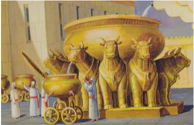 (왕상 7:23-39) [23] 또 바다를 부어 만들었으니 그 직경이 십 규빗이요 그 모양이 둥글며 그 높이는 다섯 규빗이요 주위는 삼십 규빗 줄을 두를 만하며 [24] 그 가장자리 아래에는 돌아가며 박이 있는데 매 규빗에 열 개씩 있어서 바다 주위에 둘렸으니 그 박은 바다를 부어 만들 때에 두 줄로 부어 만들었으며 [25] 그 바다를 소 열두 마리가 받쳤으니 셋은 북쪽을 향하였고 셋은 서쪽을 향하였고 셋은 남쪽을 향하였고 셋은 동쪽을 향하였으며 바다를 그 위에 놓았고 소의 뒤는 다 안으로 두었으며 [26] 바다의 두께는 한 손 너비만 하고 그것의 가는 백합화의 양식으로 잔 가와 같이 만들었으니 그 바다에는 이천 밧을 담겠더라 [27] 또 놋으로 받침 수레 열을 만들었으니 매 받침 수레의 길이가 네 규빗이요 너비가 네 규빗이요 높이가 세 규빗이라 [28] 그 받침 수레의 구조는 이러하니 사면 옆 가장자리 가운데에는 판이 있고 [29] 가장자리 가운데 판에는 사자와 소와 그룹들이 있고 또 가장자리 위에는 놓는 자리가 있고 사자와 소 아래에는 화환 모양이 있으며 [30] 그 받침 수레에 각각 네 놋바퀴와 놋축이 있고 받침 수레 네 발 밑에는 어깨 같은 것이 있으며 그 어깨 같은 것은 물두멍 아래쪽에 부어 만들었고 화환은 각각 그 옆에 있으며 [31] 그 받침 수레 위로 들이켜 높이가 한 규빗 되게 내민 것이 있고 그 면은 직경 한 규빗 반 되게 반원형으로 우묵하며 그 나머지 면에는 아로새긴 것이 있으며 그 내민 판들은 네모지고 둥글지 아니하며 [32] 네 바퀴는 옆판 밑에 있고 바퀴 축은 받침 수레에 연결되었는데 바퀴의 높이는 각각 한 규빗 반이며 [33] 그 바퀴의 구조는 병거 바퀴의 구조 같은데 그 축과 테와 살과 통이 다 부어 만든 것이며 [34] 받침 수레 네 모퉁이에 어깨 같은 것 넷이 있는데 그 어깨는 받침 수레와 연결되었고 [35] 받침 수레 위에 둥근 테두리가 있는데 높이가 반 규빗이요 또 받침 수레 위의 버팀대와 옆판들이 받침 수레와 연결되었고 [36] 버팀대 판과 옆판에는 각각 빈 곳을 따라 그룹들과 사자와 종려나무를 아로새겼고 또 그 둘레에 화환 모양이 있더라 [37] 이와 같이 받침 수레 열 개를 만들었는데 그 부어 만든 법과 크기와 양식을 다 동일하게 만들었더라 [38] 또 물두멍 열 개를 놋으로 만들었는데 물두멍마다 각각 사십 밧을 담게 하였으며 매 물두멍의 직경은 네 규빗이라 열 받침 수레 위에 각각 물두멍이 하나씩이더라 [39] 그 받침 수레 다섯은 성전 오른쪽에 두었고 다섯은 성전 왼쪽에 두었고 성전 오른쪽 동남쪽에는 그 바다를 두었더라