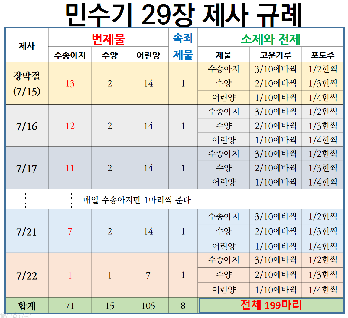◈성구 : (민 29:12-13) [12] 일곱째 달 열다섯째 날에는 너희가 성회로 모일 것이요 아무 일도 하지 말 것이며 이레 동안 여호와 앞에 절기를 지킬 것이라 [13] 너희 번제로 여호와께 향기로운 화제를 드리되 수송아지 열세 마리와 숫양 두 마리와 일 년 된 숫양 열네 마리를 다 흠 없는 것으로 드릴 것이며